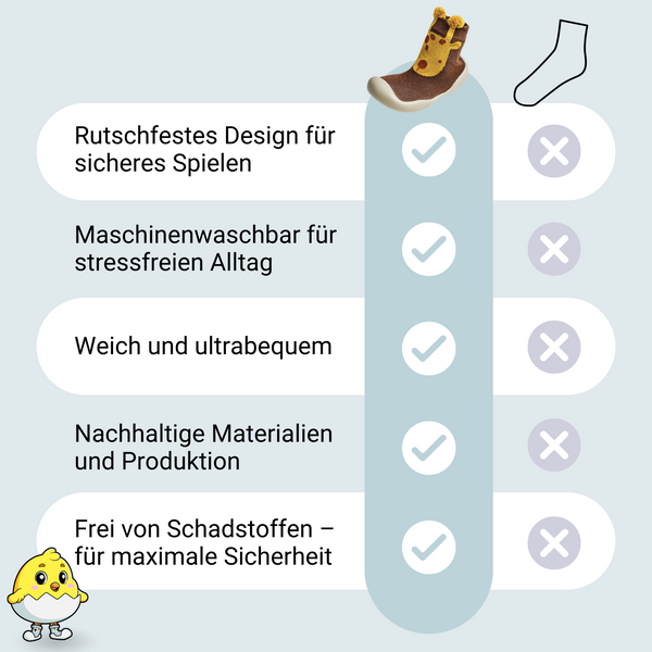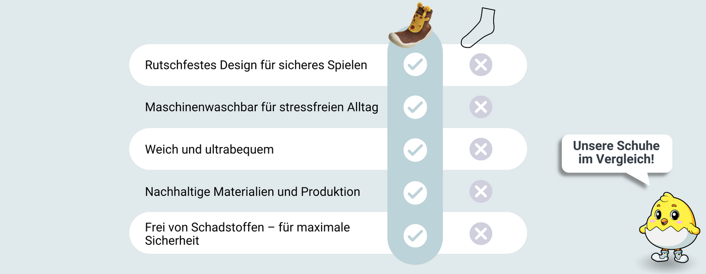 Hallo liebe Eltern, ich bin Snuggly, der beste Freund eurer kleinen Entdecker – und ich weiss genau, was Babys brauchen, wenn sie die Welt auf eigenen Füssen erobern: Halt, Sicherheit und Komfort! Die Snugglys™ sind keine normalen Babyschuhe – sie sind echte Heldenschuhe für grosse Entwicklungsschritte.